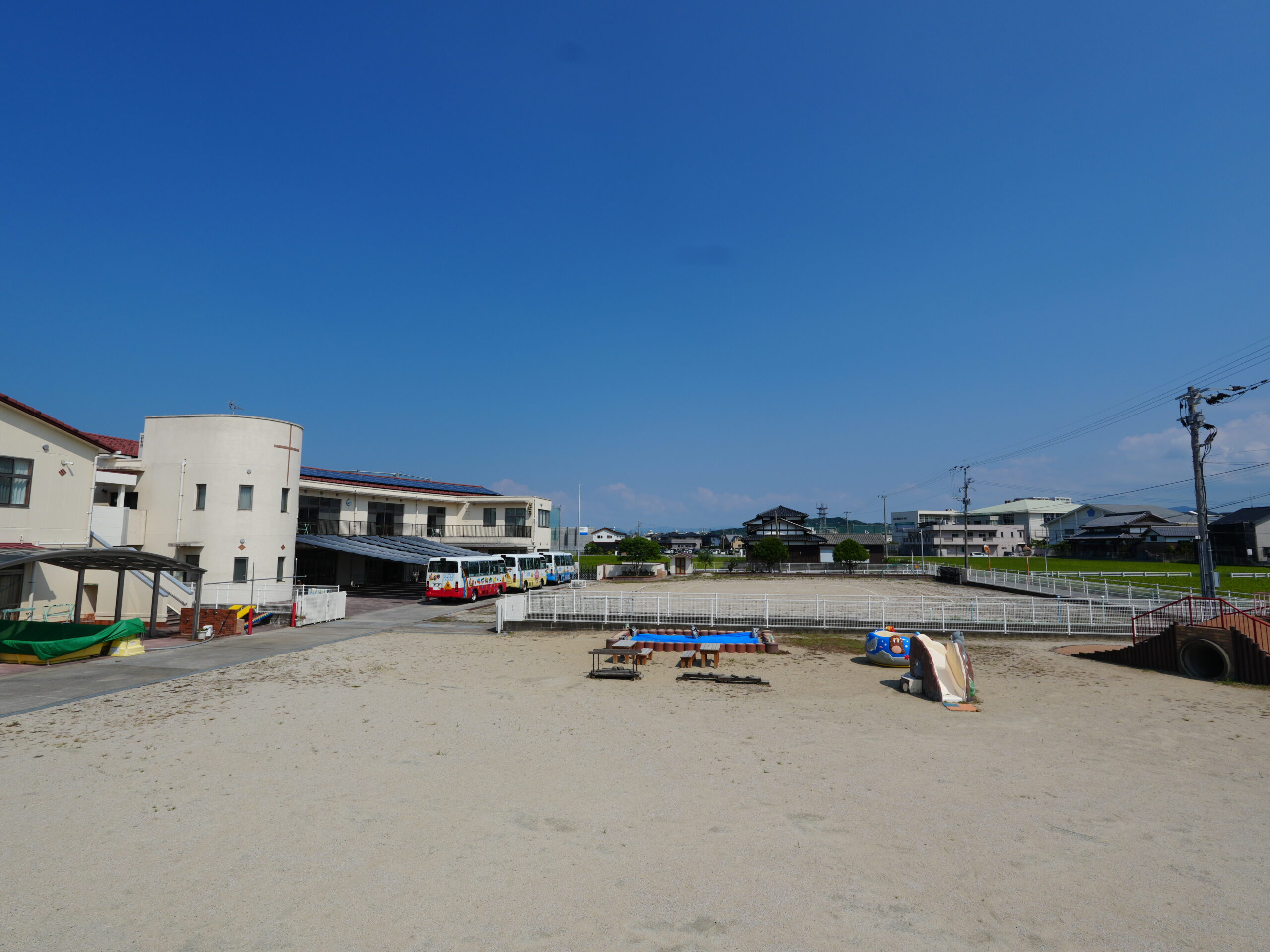 また、乳幼児用のアスレチックや砂場があり、子ども達は朝と昼それぞれ30~40分は外遊びを楽しみます。幼児クラス(3・4・5才児)では、毎金曜日に近くのスイミングスクールに通っています。